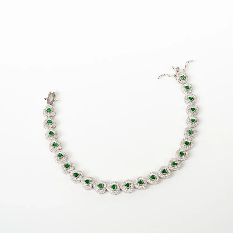 Emerald Heart: Emerald and White Hearts Silver Tennis Bracelet